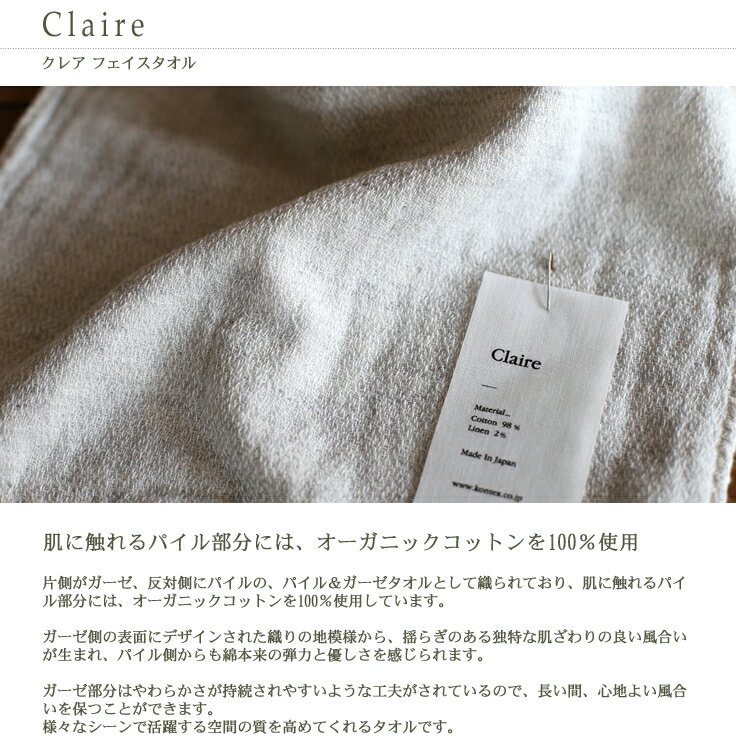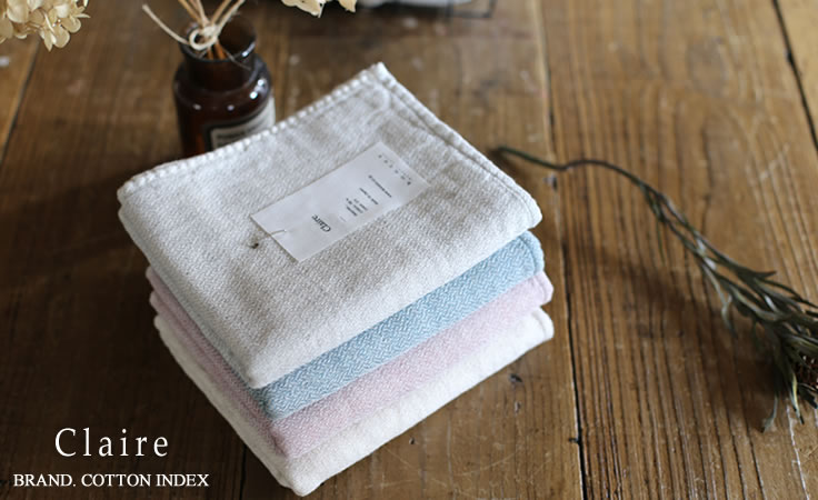 クレアは片側がガーゼ、反対側にパイルの、パイル&ガーゼタオルとして織られ、肌に触れるパイル部分には、オーガニックコットンを100%使用しています。