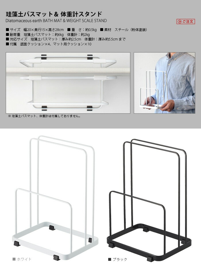 ■サイズ 幅20×奥行15×高さ28cm ■重 さ 約0.5kg ■素 材 スチール(粉体塗装) ■耐荷重 珪藻土バスマット:約6kg 体重計:約2kg ■対応サイズ 珪藻土バスマット:厚み約2.5cm 体重計:厚み約5.5cm まで ■付 属 底面クッション×4、マット用クッション×10 ■ご注意 珪藻土バスマットと体重計は付属しておりません。